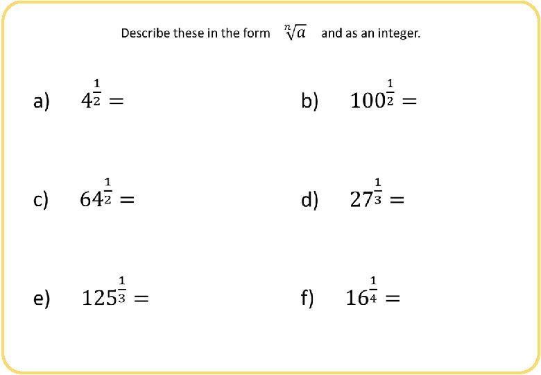 How can we split this index into two operations? Negative: reciprocal Take the reciprocal Fraction: root