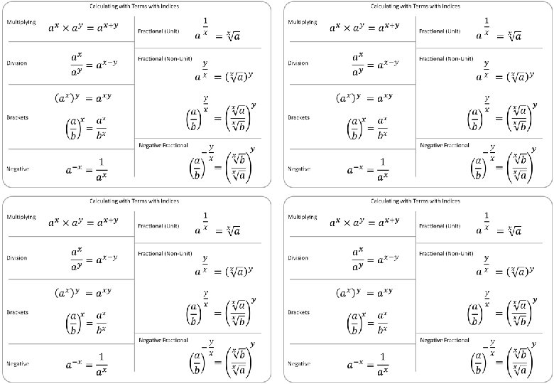 Calculating with Terms with Indices Multiplying Fractional (Unit) Fractional (Non-Unit) Division Brackets Negative Fractional Negative