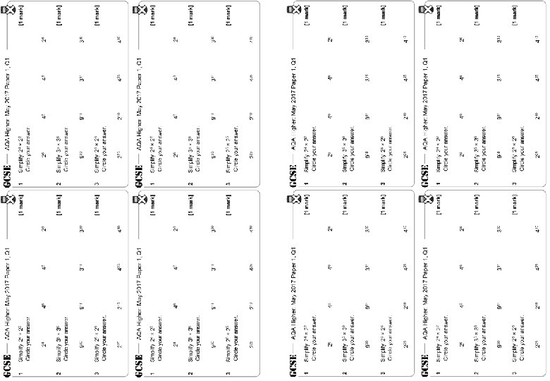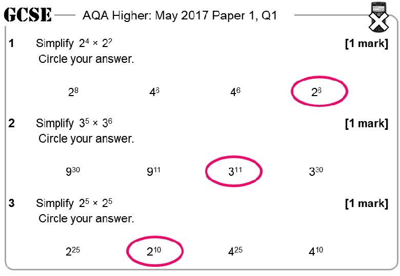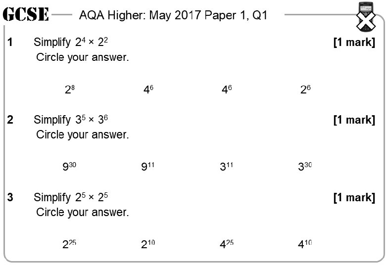 AQA Higher: May 2017 Paper 1, Q 1 1 Simplify 24 × 22 Circle your answer. 28 2 [1 mark] 46 46 311 225 425 3 410 2 311 425 330 [1 mark] 210 425 410 Simplify 24 × 22 Circle your answer. 3 [1 mark] 46 46 26 Simplify 35 × 36 Circle your answer. 930 [1 mark] 210 2 330 Simplify 25 × 25 Circle your answer. 225 311 Simplify 25 × 25 Circle your answer. 28 [1 mark] 911 1 26 Simplify 35 × 36 Circle your answer. 930 3 46 [1 mark] 911 225 [1 mark] 46 26 AQA Higher: May 2017 Paper 1, Q 1 Simplify 24 × 22 Circle your answer. 28 46 Simplify 35 × 36 Circle your answer. AQA Higher: May 2017 Paper 1, Q 1 1 [1 mark] 46 930 [1 mark] 210 2 330 Simplify 25 × 25 Circle your answer. Simplify 24 × 22 Circle your answer. 28 [1 mark] 911 1 26 Simplify 35 × 36 Circle your answer. 930 3 AQA Higher: May 2017 Paper 1, Q 1 [1 mark] 911 330 Simplify 25 × 25 Circle your answer. 225 [1 mark] 210 425 410