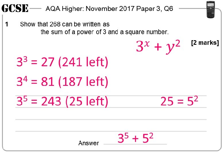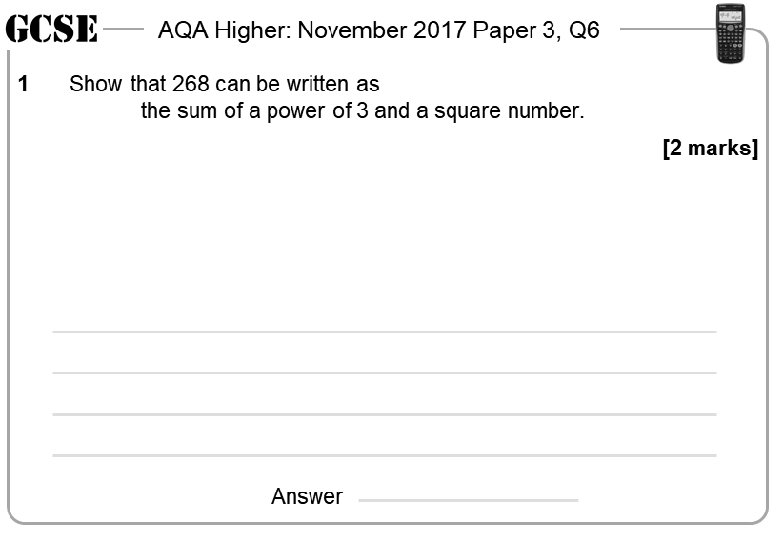 AQA Higher: November 2017 Paper 3, Q 6 1 AQA Higher: November 2017 Paper 3, Q 6 Show that 268 can be written as the sum of a power of 3 and a square number. 1 Show that 268 can be written as the sum of a power of 3 and a square number. [2 marks] Answer AQA Higher: November 2017 Paper 3, Q 6 1 Show that 268 can be written as the sum of a power of 3 and a square number. [2 marks] Answer