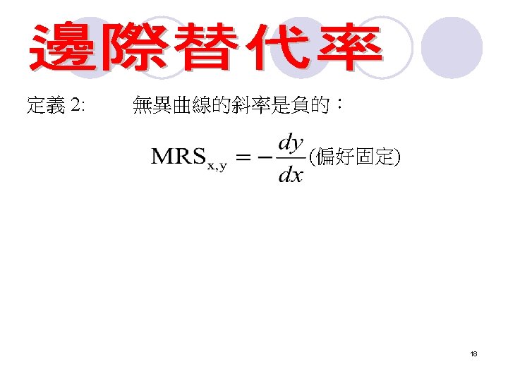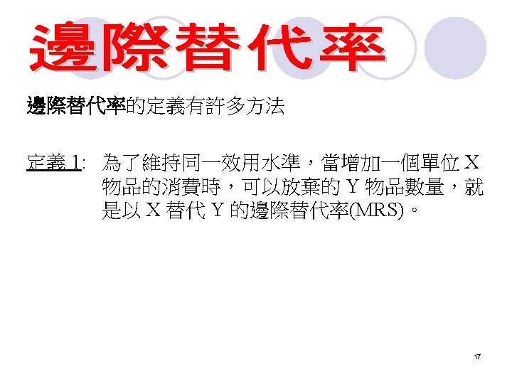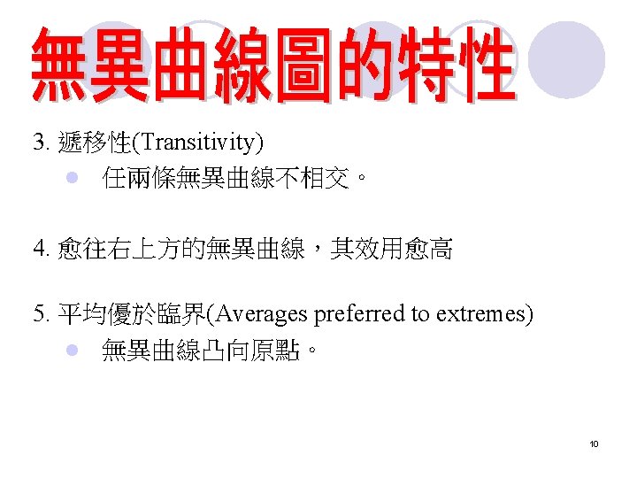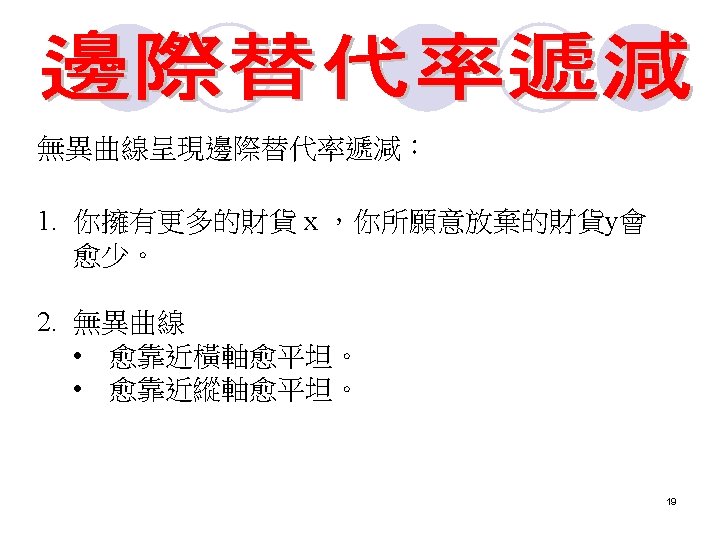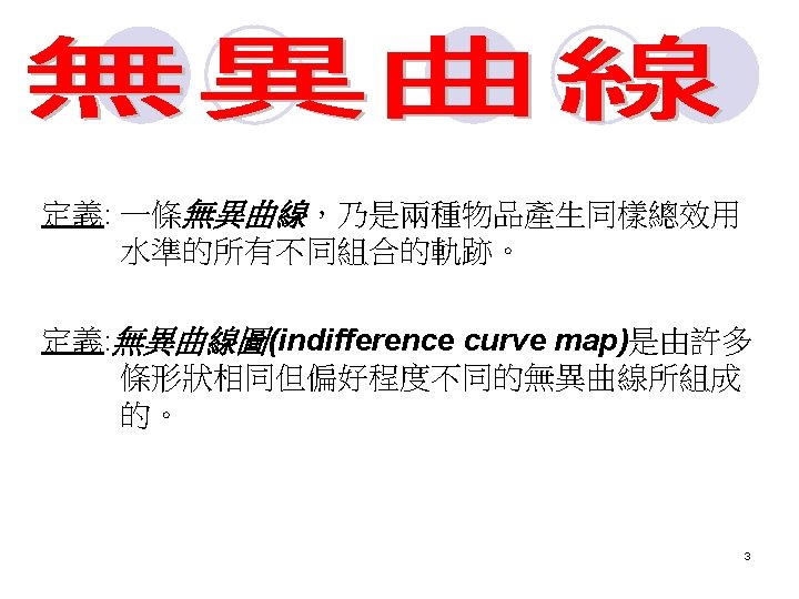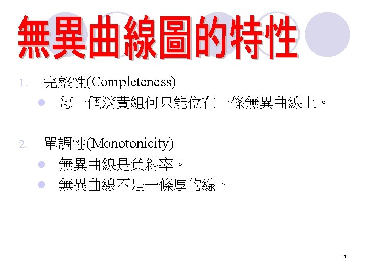 無異曲線(Indifference Curves ) 2. 邊際替代率(The Marginal Rate of Substitution) 3. 效用函數(The Utility Function) l 邊際效用(Marginal Utility) 4. 特殊函數型態(Some Special Functional Forms) 1. 2