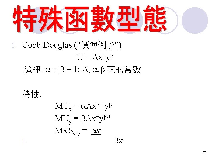 y Example: Graphing Indifference Curves 偏好方向 IC 2 IC 1 x 36
