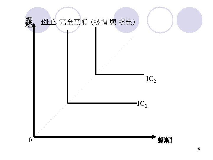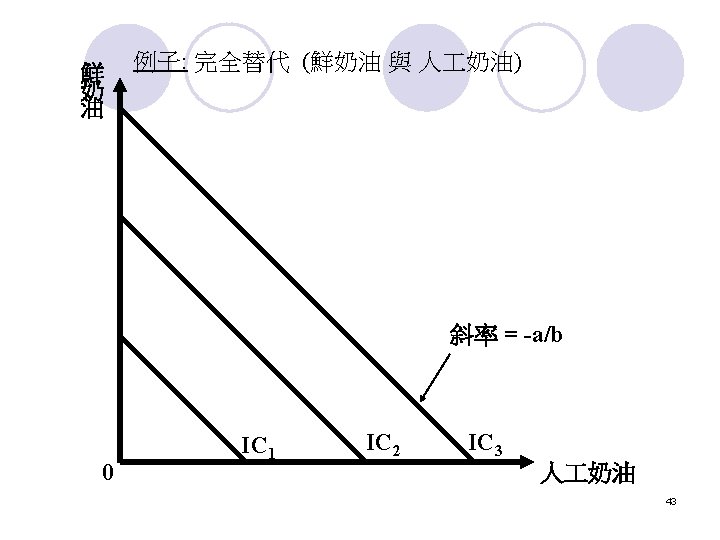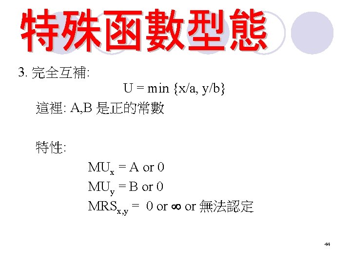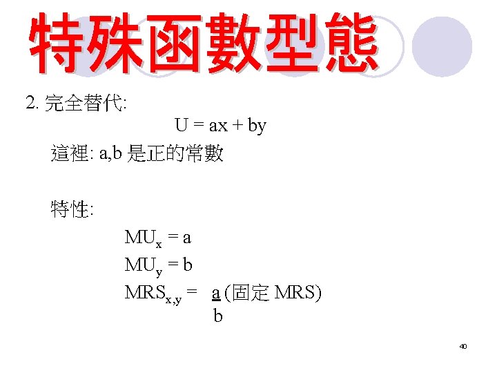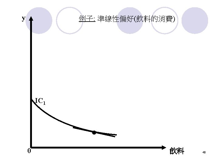 4. 準線性效用函數(Quasi-Linear Utility Functions): U = a. V(x) + by 這裡: a, b 是正的常數, 而且 v(0) = 0 特性: MUx = av’(x) MUy = b MRSx, y = av’(x) (僅受x影響) b 47
