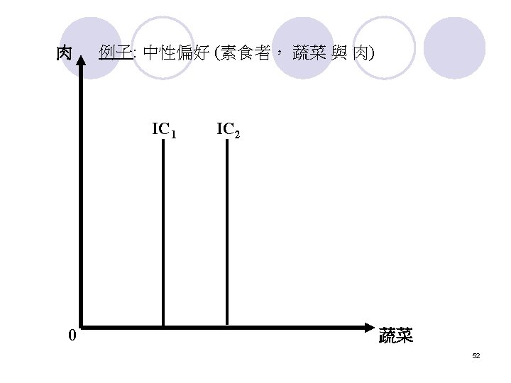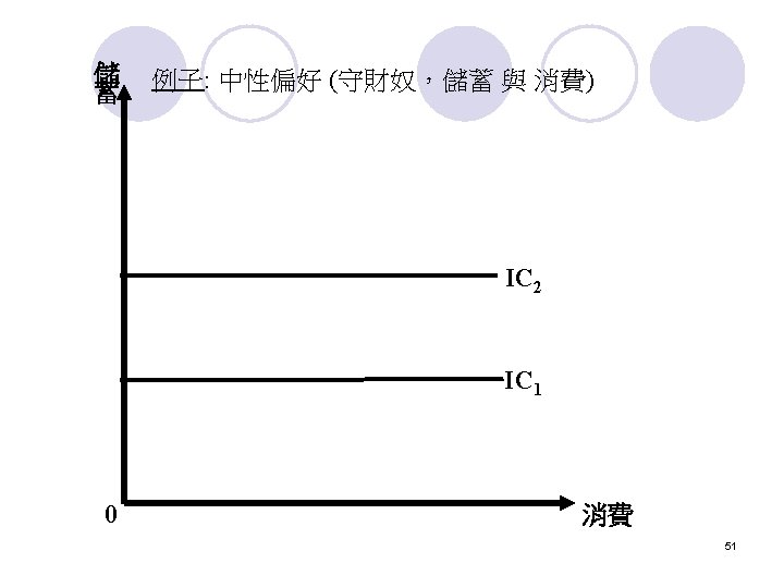 4. 中性偏好(neutral preference): U(x, y) =V(x) 或 U(x, y) =V(y) 這裡: v(0) = 0 特性: MUx = 0, MUy> 0 或 MUy = 0, MUx> 0 50