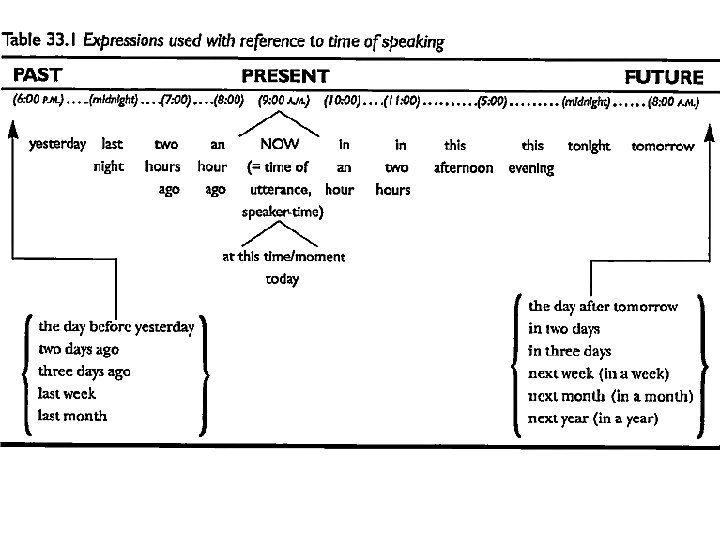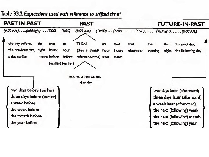 Adverbs and adverbial phrases of time change as follows: Direct Indirect today yesterday the day before yesterday tomorrow the day after tomorrow next week/year etc. last week/year etc. ago that day the day before two days before the next day/the following day in two days' time the following week/year eth. the previous week/year etc. a year before/the previous year 'I saw her the day before yesterday, ' he said = He said he'd seen her two days before. 'I'll do it tomorrow, ' he promised = He promised that he would do it the next day. 'I'm starting the day after tomorrow, mother, ' he said = He told his mother that he was starting in two days' time. She said, 'My father died a year ago' = She said that her father had died a year before/the previous year.