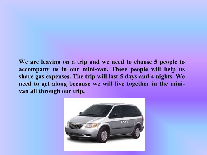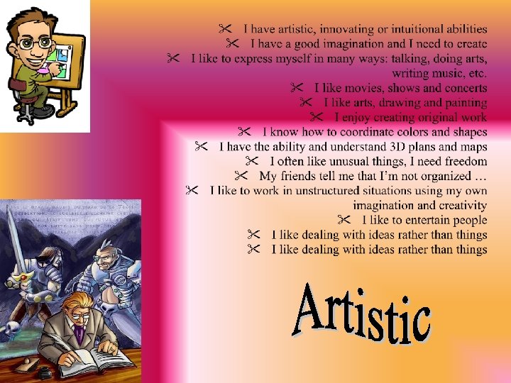 I like movies, shows and concerts. I like arts, drawing and painting. I like to do creative activities and I’m imaginative. I have a good esthetic sense. I know how to do good agencies of colors and shapes. I like to entertain people. I have the ability to read and understand 3 D plans and maps. TOTAL