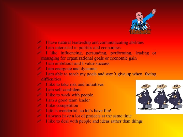 I like to organize activities. I like to lead and persuade people. I am a good team leader. I like competition. I am energic and dynamic. I am able to reach my project’s goals and I don’t give up. when I face difficulties. I am self-confident. TOTAL