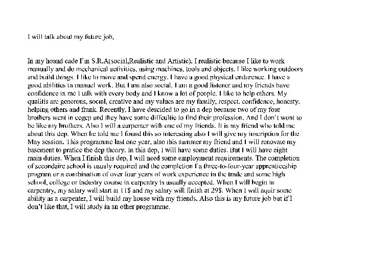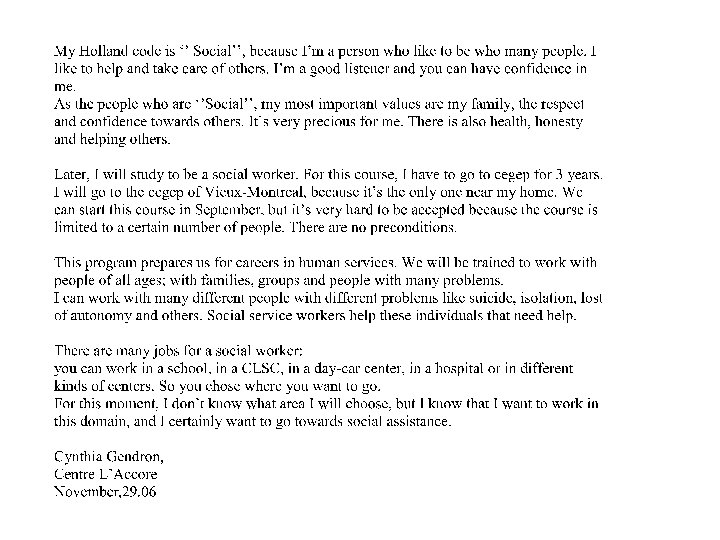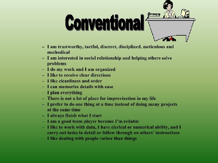 I am trustworthy. I like to act in a set, orderly way. I like to receive clear orders I like cleanness and order I am minutious and methodic I am tactful, discreet and disciplined. I do my work with exactness. I am good at typing my homework using a computer and I can use a calculator quickly. TOTAL