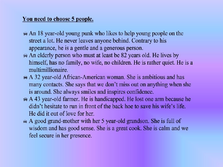 -Who am I? -What are my strenghts? -What could I do later in life? -What are my priorities?