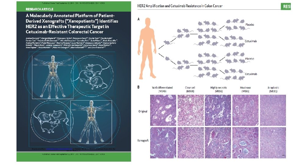 How is HER 2 discovered as a candidate target in m. CRC HER 2 gene is abnormal in 3% of m. CRC Liver mets were collected from hundreds of m. CRC patients and transplanted the tumor in mice creating an avatar for each patient. The avatars were treated with cetuximab, the standard biological drug for m. CRC, and measured the response of the tumor in the avatar. The tumor DNA of avatars that failed to respond to cetuximab were analyzed. It was confirmed that avatars with mutated KRAS, NRAS and BRAF genes were unresponsive to cetuximab. Also found that avatars with an abnormal number of copies of the HER 2 gene in their tumor did NOT RESPOND to cetuximab! Bertotti, Cancer Discovery, 2011 | Bertotti, Nature 2015