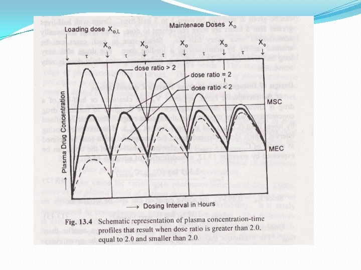 Xo, L = 1 (1 -e – Ka () ז 1 -e – KE ) ז �When the drug is given I. V. or when absorption is extremely rapid, the absorption phase is neglected and the above equation reduces to accumulation index : Xo, L = 1 = Rac Xo (1 -e – KE ) ז �The ratio of loading dose to maintenance dose Xo, L/Xo is called as dose ratio. As the rule when = ז t 1/2 , dose ratio equals 2. 0, > ז t 1/2 , dose ratio is smaller than 2. 0 < ז t 1/2 , dose ratio is grater than 2. 0.