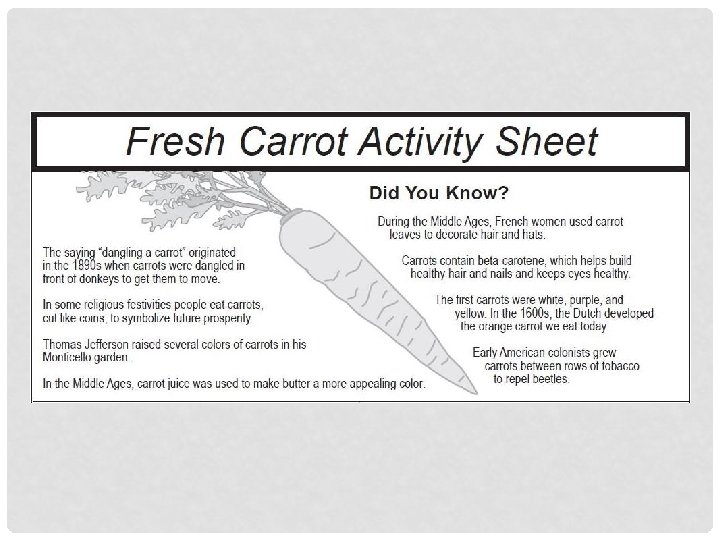 FANTASTIC FACTS 1. 2. 3. 4. 5. Carrots come in many colors including orange, white, yellow, and purple. Commercial carrots are mechanically harvested by first loosening the soil underneath the root, then lifting the carrots by their tops. The main reason for the recent increase in carrot production is ready-to-eat, convenient packaging of baby carrots. Baby carrots are long, smalldiameter carrots peeled and cut into pieces. Conveniently packaged to be ready-to-eat, baby-cut carrots keep in the refrigerator in their original bag for up to three weeks.
