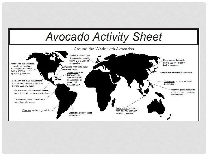 FANTASTIC FACTS 1. 2. 3. 4. 5. Avocados are a fruit. Avocados are harvested by hand using special shears called clippers. Avocados are sodium and cholesterol-free. Avocados also are a good source of fiber and folate. Indonesians enjoy mixing avocados with milk and coffee to make a cold drink.