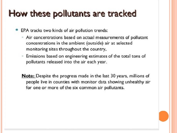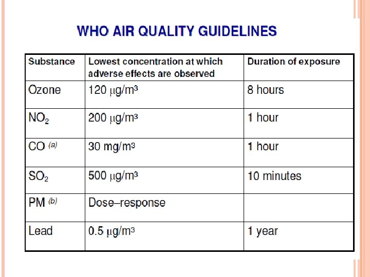 MAJOR OUTDOOR AIR POLLUTANTS 1. 2. 3. 4. 5. Particulate matter Ozone Nitrogen oxides Carbon monoxide Sulfur dioxide