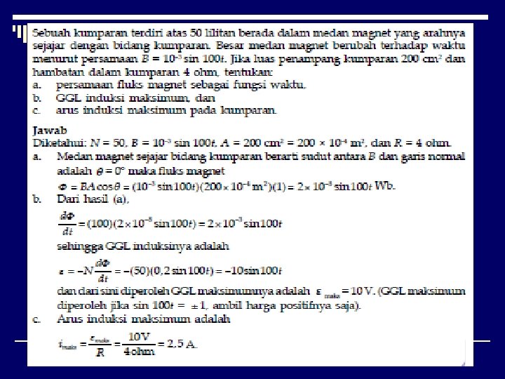 Faktor-faktor yang Menentukan Besar Ggl kembali terus Induksi elektromagnet Generator Transformator Efisiensi Transformator Transmisi Tegangan tinggi Latihan keluar Besarnya ggl induksi bergantung pada tiga faktor, yaitu: o Banyaknya lilitan kumparan o Kecepatan keluarmasuk magnet dari dan ke dalam kumparan o Kuat magnet yang digunakan 3. 0 5. 0 4. 0 2. 0 A