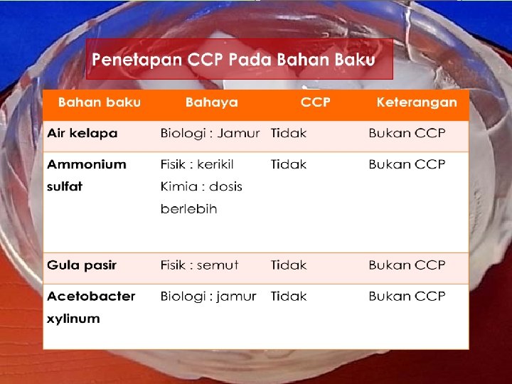 CCP Pada tahapan Proses Tahapan Proses Bahaya CCP Perebusan Biologi: masih adanya bakteri patogen Fisik: terikutnya benda asing dari alat Ya Mixing & Filling Biologi: kontaminan mikroba dari pekerja Fisik : Adanya rambut Ya Inokulasi Biologi: Ya Kontaminan dari udara