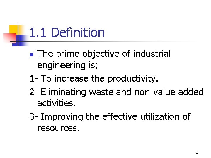 1. 1 Definition The prime objective of industrial engineering is; 1 - To increase the productivity. 2 - Eliminating waste and non-value added activities. 3 - Improving the effective utilization of resources. n 4