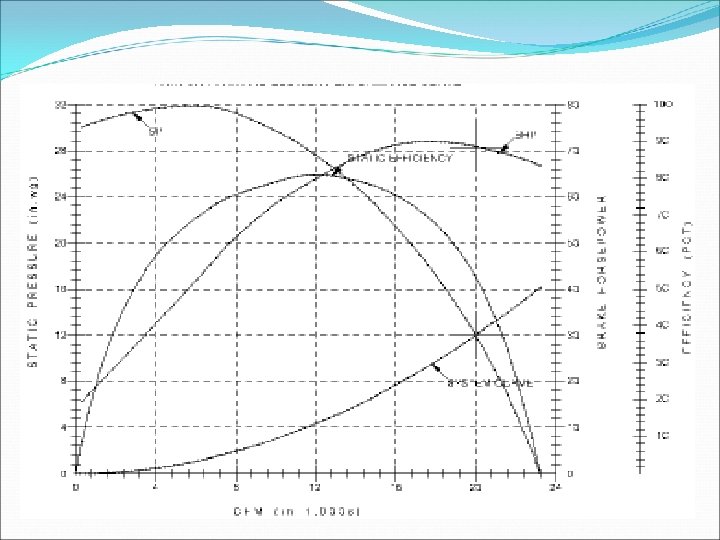 Fan Characteristics �The intersection of the system curve and the static pressure curve defines the operating point. � When the system resistance changes, the operating point also changes. � Once the operating point is fixed, the power(BHP) required could be found.