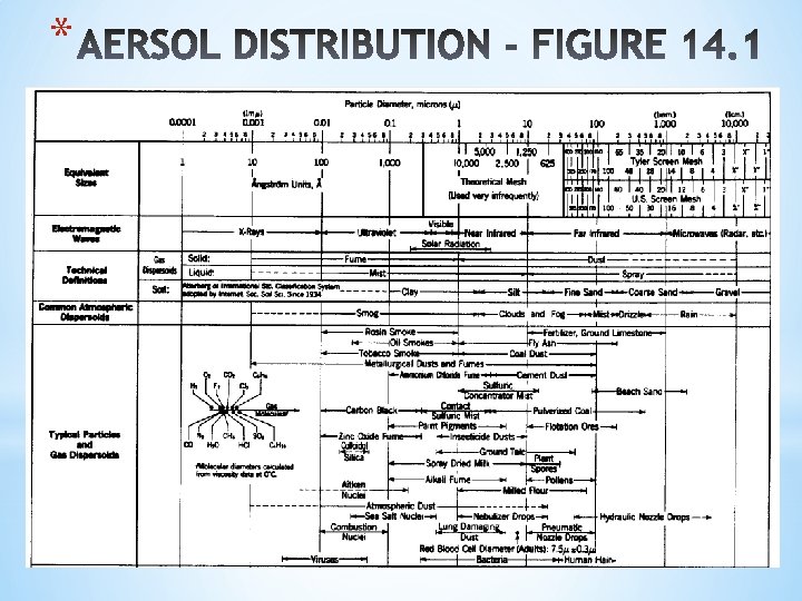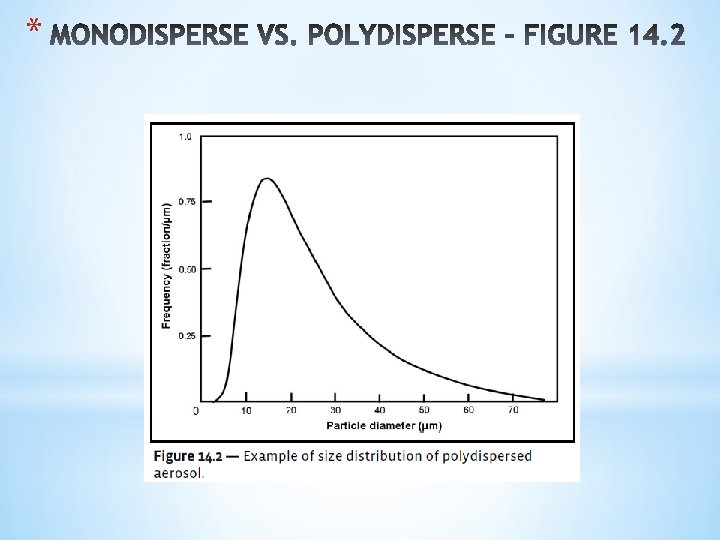 * *Aerosol distribution – Figure 14. 1 Refer to info regarding size ranges and general definition of particle types. *Monodisperse (single particle size) vs. Polydisperse (range of particle sizes) Figure 14. 2 *Particle size distribution: log normal !!! Tail that extends out to larger particles.