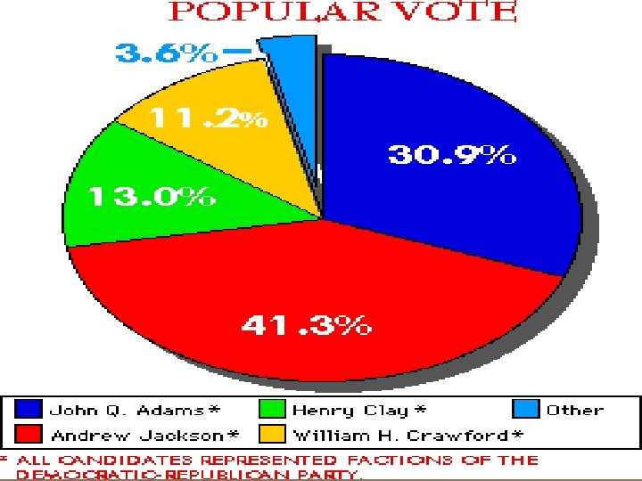 Election of 1824 Electoral Vote Popular Vote House Vote Jackson 99 153, 544 7 Adams 84 108, 740 13 Crawford 41 46, 618 4 Clay 37 47, 136 - Candidate