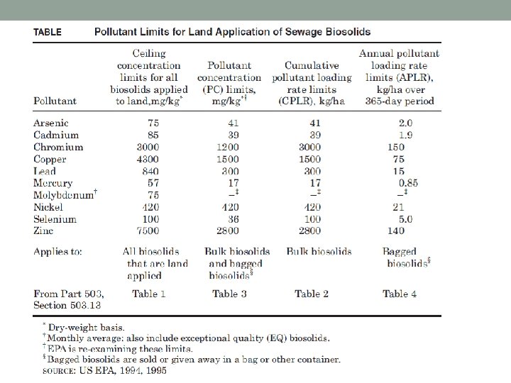 Regulatory requirements Land application Bio-soilds applied to land either to condition the soil or to fertilize crops in the soil - Bio-soilds can apply to land in bulk or sold or in bags. - The application sites may be nonpublic contact sites 9 agricultural lands, forests, reclamation sites). Public contact sites (public parks, roadsides, lawns and home gardens). - All land application of bio-solids must meet the ceiling concentration limits for 10 heavy metals listed in the second column of below table. - Bio-solids applied to the land must meet pollutant concentration (PC limits , commutative pollutant loading rate (CPLR) limits