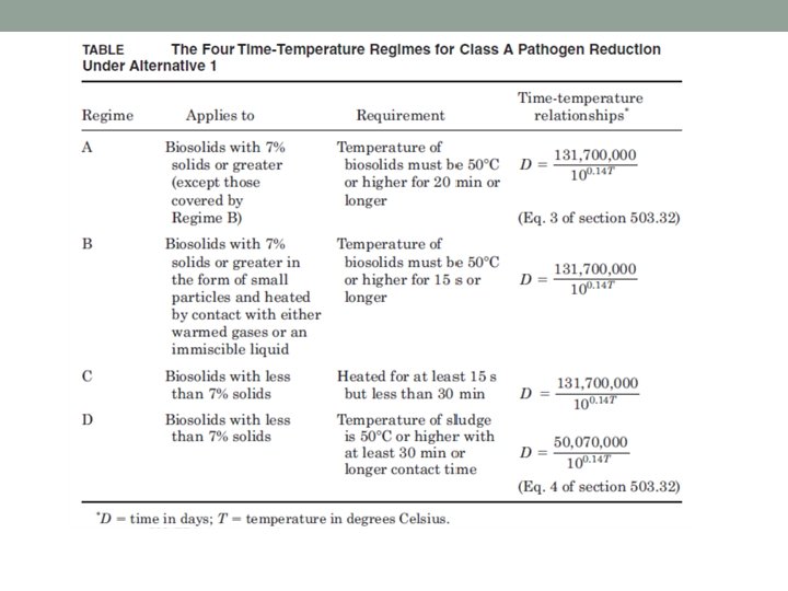 Regulatory requirements EXAMPLE 1 What is the required minimum time to achieve Class A pathogen requirement when a bio-solid with 15% solids content is heated at 60 o. C ?
