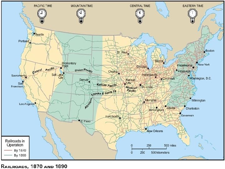 Transcontinental Railroad �Completed in 1869 �Workforce was largely immigrants from China and Ireland �Thousands lost their lives and tens of thousands were injured laying track �Government will violate treaties with Native Americans in order to gain land in the West for RR and settlers.