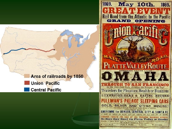 Transcontinental Railroad n n Pacific Railway Act of 1862 – U. S. Government hired Union Pacific and Central Pacific Railway Company to extend railways across the United States. Central Pacific – Started in Sacramento, CA Union Pacific – Started in Omaha, NE The 2 railroad companies met in Promontory, Utah to drive the “Golden Spike” on May 10, 1869
