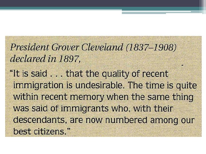 Chinese Exclusion Act • Resentment and discrimination against the Chinese. • First law to restrict immigration. • Taking away jobs from Nativists Chinese Exclusion Act 1