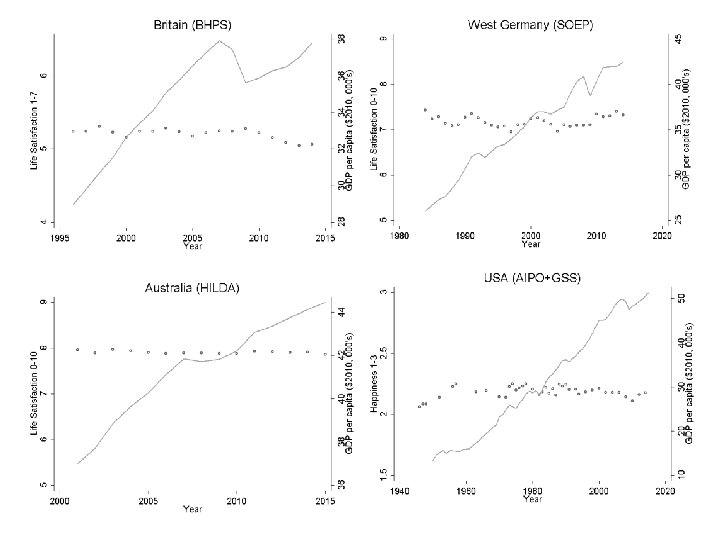 Note 6. Causality? Let’s just say that this has been treated in a pretty cavalier fashion in this literature. Changes in income happen for a reason: could be that it is this reason that affects well-being, not income inequality as such. Or that happiness causes inequality, rather than inequality causing happiness. So all we need is an exogenous movement in the income distribution…