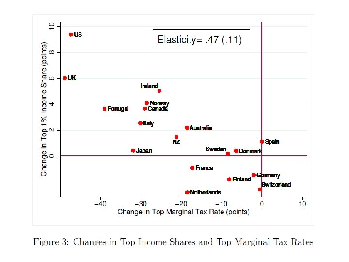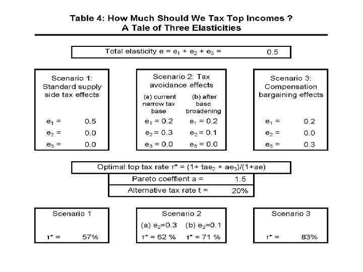 Optimal Taxation of Top Labor Incomes • Standard optimal top tax rate formula: τ = 1/(1+ae) With: e = elasticity of labor supply, a = Pareto coefficient • τ ↓ as elasticity e ↑ : don’t tax elastic tax base • τ ↑ as inequality ↑, i. e. as Pareto coefficient a ↓ (US: a≈3 in 1970 s → ≈1. 5 in 2010 s; b=a/(a-1)≈1. 5 → ≈3) (memo: b = E(y|y>y 0)/y 0 = measures fatness of the top) • Augmented formula: τ = (1+tae 2+ae 3)/(1+ae) With e = e 1 + e 2 + e 3 = labor supply elasticity + income shifting elasticity + bargaining elasticity (rent extraction) • Key point: τ ↑ as elasticity e 3 ↑