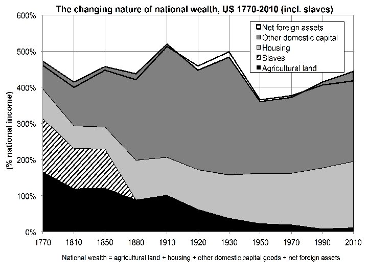 800% National wealth in 1770 -1810: Old vs New world 700% (% national income) 600% Other domestic capital Housing Slaves 500% Agricultural Land 400% 300% 200% 100% 0% UK France US South US North