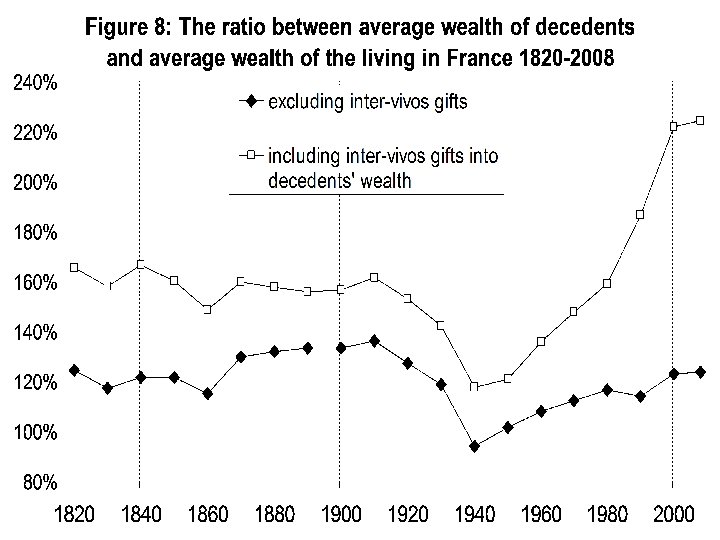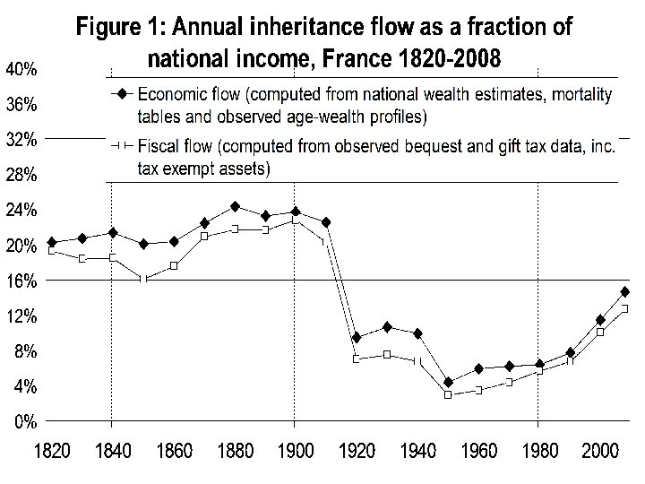 • An annual inheritance flow around 20%-25% of disposable income is a very large flow • E. g. it is much larger than the annual flow of new savings (typically around 10%-15% of disposable income), which itself comes in part from the return to inheritance (it’s easier to save if you have inherited your house & have no rent to pay) • An annual inheritance flow around 20%-25% of disposable income means that total, cumulated inherited wealth represents the vast majority of aggregate wealth (typically above 80%-90% of aggregate wealth), and vastly dominates self-made wealth