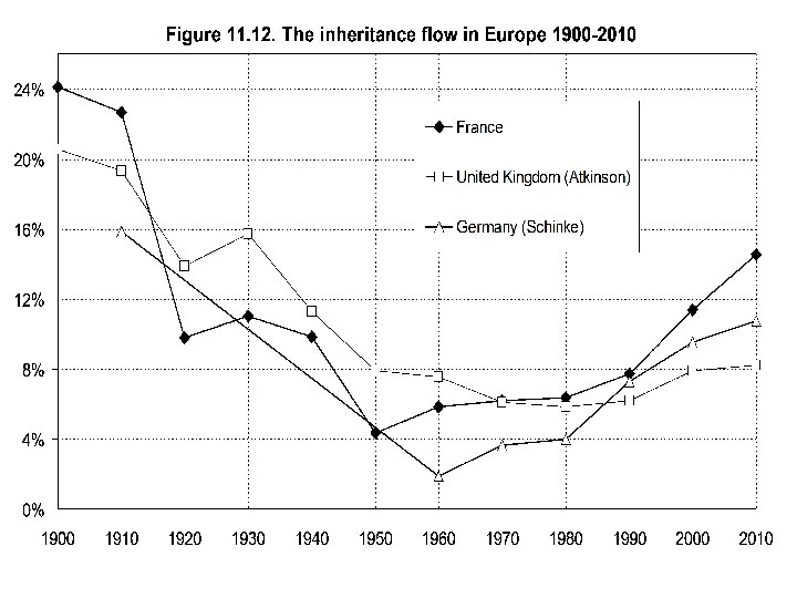 2. The return of inherited wealth • In principle, one could very well observe a return of wealth without a return of inherited wealth • I. e. it could be that the rise of aggregate wealthincome ratio is due mostly to the rise of life-cycle wealth (pension funds) • Modigliani life-cycle theory: people save for their old days and die with zero wealth, so that inheritance flows are small