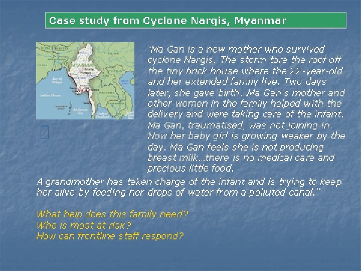 Simple measures and basic interventions 1. 2. 3. 4. 5. 6. 7. Shelter, water, food, security to U 2 households Registration of vulnerable groups, e. g. orphans Supportive places to breastfeed Priortise pregnant and lactating women Complementary feeding needs Newborns: early initiation of breastfeeding Frontline support: breastfed & non-breastfed infants