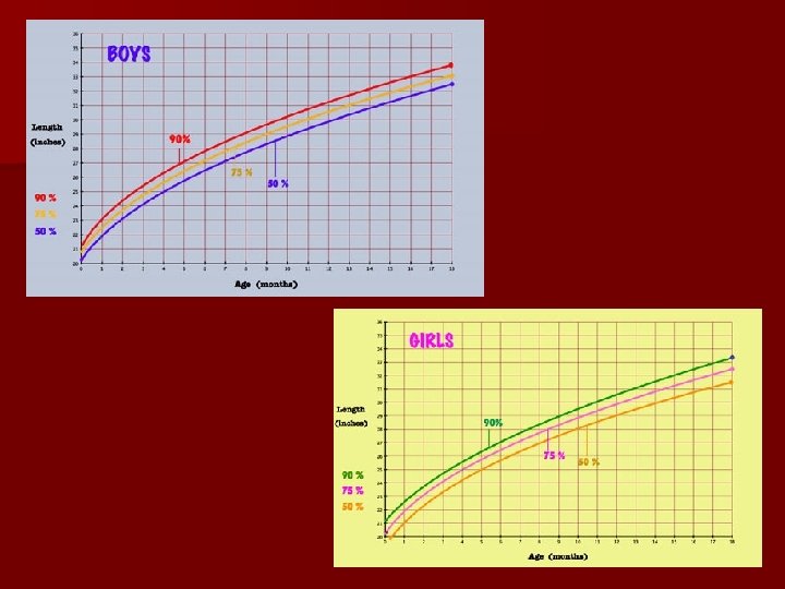 Growth and development Males Females Age Length/in Weight/lbs Birth 19 3/4 7. 5 19. 5 7. 5 3 months 24 13 23. 5 12 1/4 6 months 26. 5 17. 5 25. 5 15. 5 9 months 28 20. 5 27. 5 18 ¾ 12 months 29 22. 5 29 21