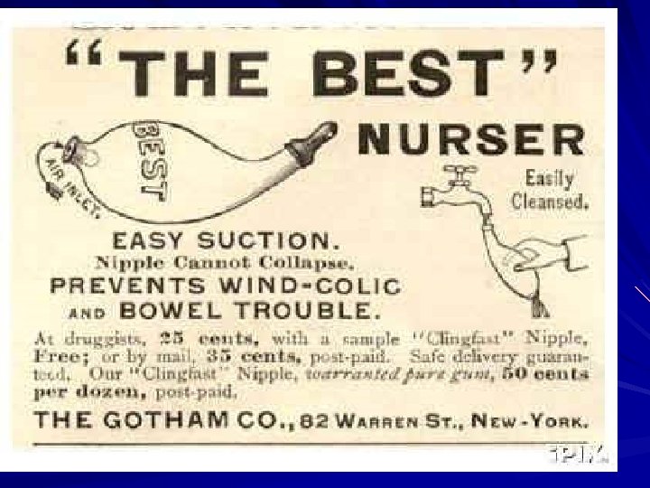 Early 20 th century – Electric refrigeration and pasteurization Significant decrease in mortality Increased popularity of formula feeding – Improved sanitation and milk handling – Modifications in cow protein improved digestibility – Direct advertising to physicians influenced use of formulas