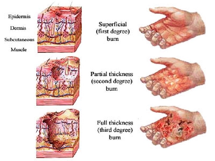 Burn Type • Minor < 15% BSA and not involving face, hands, feet, or genitalia • Moderate burns Partial thickness, second degree, covering > 15% but < 30 % BSA or full thickness <10 BSA • Major (severe) burns Partial thickness, 2 nd degree, involving 30% BSA or full thickness involving > 10% BSA or face, hands, feet, genitalia