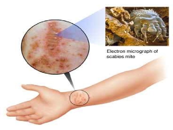 Treatment and Nursing Care of children with scabies • Precede treatment with warm bath • Cool dry skin • Wash linens very hot water and hot dryer • Eli mite (permethrin) cream: leave on 8 to 12 hours
