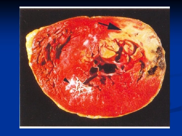 TIPOS DE INFARTO n Transmural - necrose isquêmica envolve toda ou quase toda a espessura da parede ventricular irrigada pela coronária afetada n Subendocárdico - áreas de necrose isquêmica limitadas ao terço interno ou, no máximo, à metade da parede ventricular http: //www. cardiologos. org/electro/images