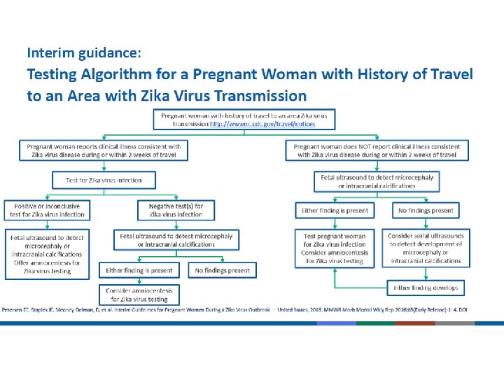 Virus de Zika en el Embarazo • La incidencia de Zika en el embarazo se desconoce • Una mujer embarazada puede ser infectada por picadura de mosquito o por relaciones sexuales con una persona infectada • La infection puede ocurrir en cualquier trimester y afectar al feto • No hay evidencia de mayor susceptibilidad a infeccion por Zika • El curso clinico es similar al de las personas no embarazadas • Se ha encontrado el virus de Zika en: Liquido amniotico, Placenta, Productos de concepccion Centers for Disease Control and Prevention, CDC Health Advisory: Recognizing, Managing, and Reporting Zika Virus Infections in Travelers Returning from Central America, South America, the Caribbean and Mexico, 2016. Besnard, M. , et al. , Evidence of Perinatal Transmission of Zika Virus, French Polynesia, December 2013 and February 2014. Euro Surveill, 2014. 19(14): p. 1 -5. Oliveira Melo, A. , et al. , Zika Virus Intrauterine Infection Causes Fetal Brain Abnormality and Microcephaly: Tip of the Iceberg? Ultrasound in Obstetrics & Gynecology, 2016. 47(1): p. 6 -7.