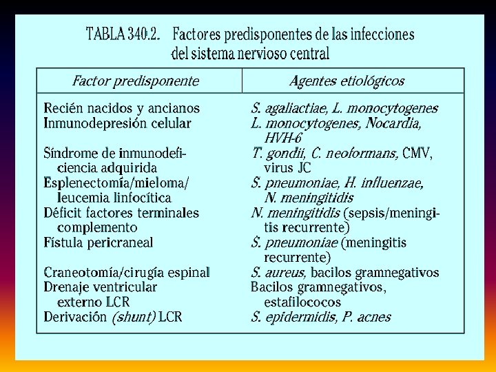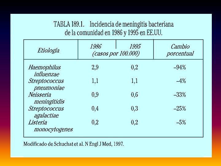 MENINGITIS PIOGENAS • Adquiridas en la comunidad, raras veces son nosocomiales. • Pueden ser producidas por muchas bacterias, pero las llamadas, “patógenos meningeos”, son las habituales: neisseria meningitidis, haemophilus influenzae, streptococcus pneumoniae, streptococcus agalactiae y listeria monocytógena. • Más frecuentes en niños y ancianos. • En el recién nacido la incidencia mayor es por S. Agalactiae, E. Coli y L. Monocitógena. • En la meningitis nosocomial predominan el estafilococo y los bacílos gramnegativos. • Con la vacunación contra el H. Influenzae tipo B, su incidencia ha disminuido considerablemente.