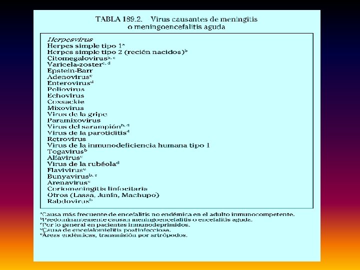 MENINGITIS y MENINGOENCEFALITIS PATOGENIA. Penetración: • VÍA HEMATÓGENA: – Foco infeccioso distante, colonización inicial de la nasofaringe, picadura de un artrópodo, mordedura de un mamífero, a través de la placenta. • VÍA NEURONAL: – Virus de la rabia, VH 1 y VH 2, . A través de las terminaciones nerviosas olfatorias como el virus del herpes, y de la rabia, (en cuevas con murciélagos infectados); la naegleria fowleri a través de grietas traumáticas de la lámida cribiforme bulbo olftorio encéfalo. • POR CONTIGUIDAD: – Sinusitis, otitis, mastoiditis. • INOCULACIÓN DIRECTA: – Cirugía del SNC, trumatimos craneales.
