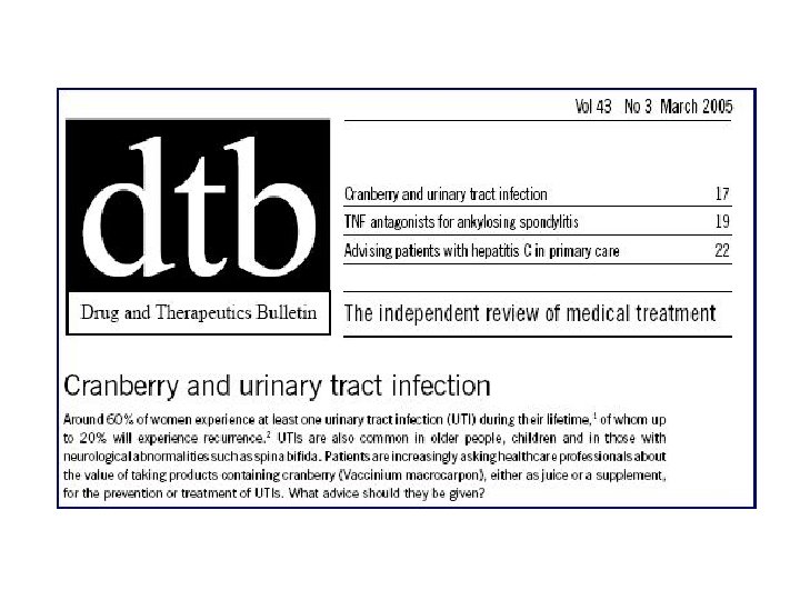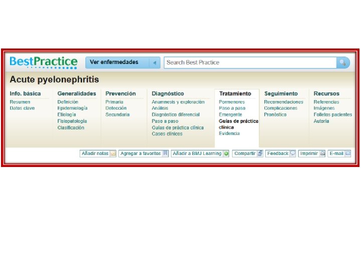 Infecciones urinarias recurrentes Autotratamiento – Las mujeres que quieren minimizar el consumo de ATB, serian candidatas para el autodiagnóstico y el autotratamiento con una pauta corta de ATB. – Uso restringido a mujeres que han documentado infecciones recurrentes, estén motivadas, cumplen las instrucciones médicas y tienen una buena relación médico-paciente. – Deben consultar si los síntomas no se resuelven a las 48 h. Upto. Date 2014