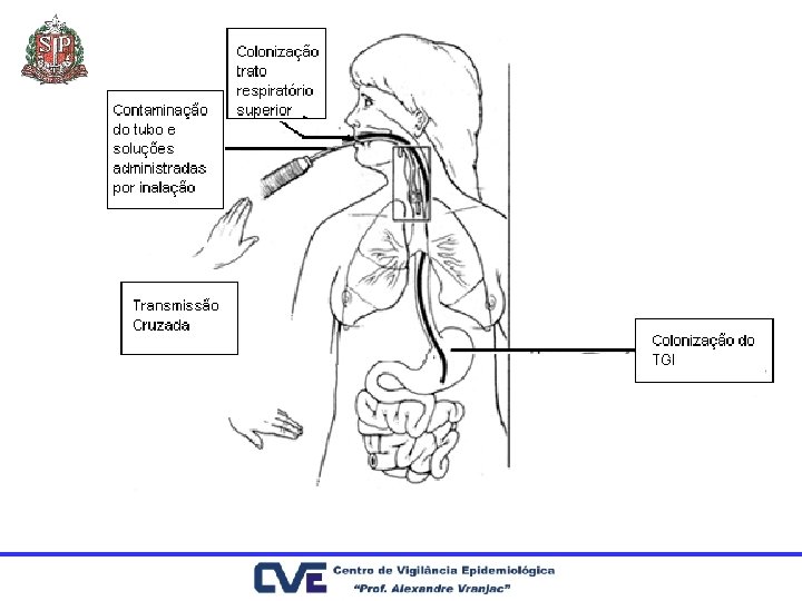 Infecções Relacionadas a Dispositivos Etiologia Pneumonia • • Colonização de Orofaringe Flora Trato Gastrointestinal Contaminação de soluções aerossóis Infecção cruzada