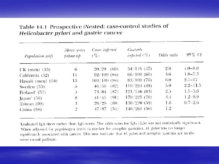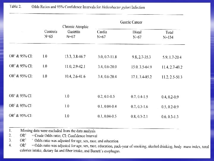 H. pylori Infection and Stomach Cancer in Whites at MSKCC H. Pylori no yes case/control 69/54 67/15 Infection rates: 21. 7% in controls 49. 3% in cases OR 1. 00 3. 50 (1. 80 -6. 79)