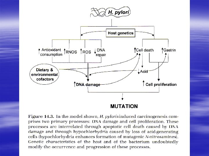 Helicobacter pylori § Helicobacter pylori was the first bacterium to be officially recognized as a cancer-causing agent § Flagellated gram-negative, spiral-shaped rod bacterium § Chronically infects 50% of the worldwide population – In developing countries, infection is universal among adults and about half of children <10 years are infected – In developed countries, 40 -50% of adults are infected and infection among children is unusual § Roughly 1% of those infected eventually develop stomach cancer § Infection is inversely correlated with socioeconomic status (from household crowding, less household sanitation and hygiene) § Nitrates and nitrites are substances commonly found in cured meats, some drinking water, and certain vegetables, that can be converted by H. pylori into compounds that have been found to cause stomach cancer in animals § 5. 5% of ALL cancers attributed to H. pylori