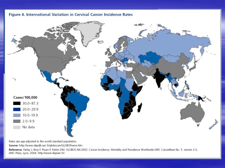 § § § Human Papillomavirus Nonenveloped DNA virus More than 70 different types Infects the squamous epithelium of the genital tract, skin, and upper respiratory tract § Most infections are transient § Infection of the genital tract highly prevalent worldwide – Higher prevalence in younger women than older (In US, 30 -40% in young women visiting university health clinics vs. 17% in older women visiting HMO clinics) § High-risk HPV detected in 90 -95% of cervical cancers § Mechanism of carcinogenesis: oncogenic proteins (E 6 and E 7) § 5. 2% of ALL cancers attributed to HPV