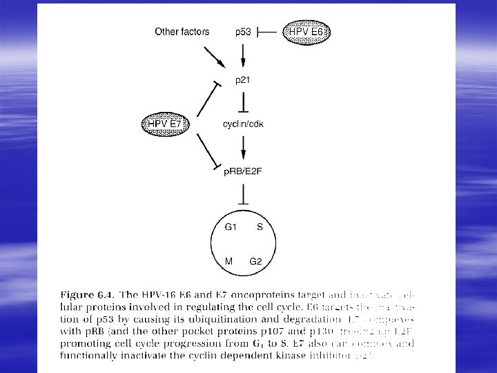 Mechanism of Carcinogenesis § HPV DNA integrates into host genome. § Often, E 2/E 1 gets disrupted during integration and no longer regulates E 6/E 7 proteins. § E 6/E 7 expression increases. § E 6 interacts with p 53 and promotes the degradation of p 53. § E 7 interacts with p. RB and releases E 2 F which promotes cell cycle progression. § E 7 interacts with p 21 and inhibits it so that it cannot inhibit cyclin dependent kinase.