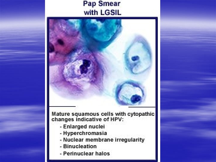 HPV Testing and Typing § Low-risk: HPV 6, 11, 40 s, strongly associated with LGSIL, rarely associated with HGSIL, never associated with cancer § Intermediate-risk: HPV 31, 33, 35, 51, 52, strongly associated with HGSIL § High-risk: HPV 16, 18, 45, 56, strongly associated with HGSIL and cancer